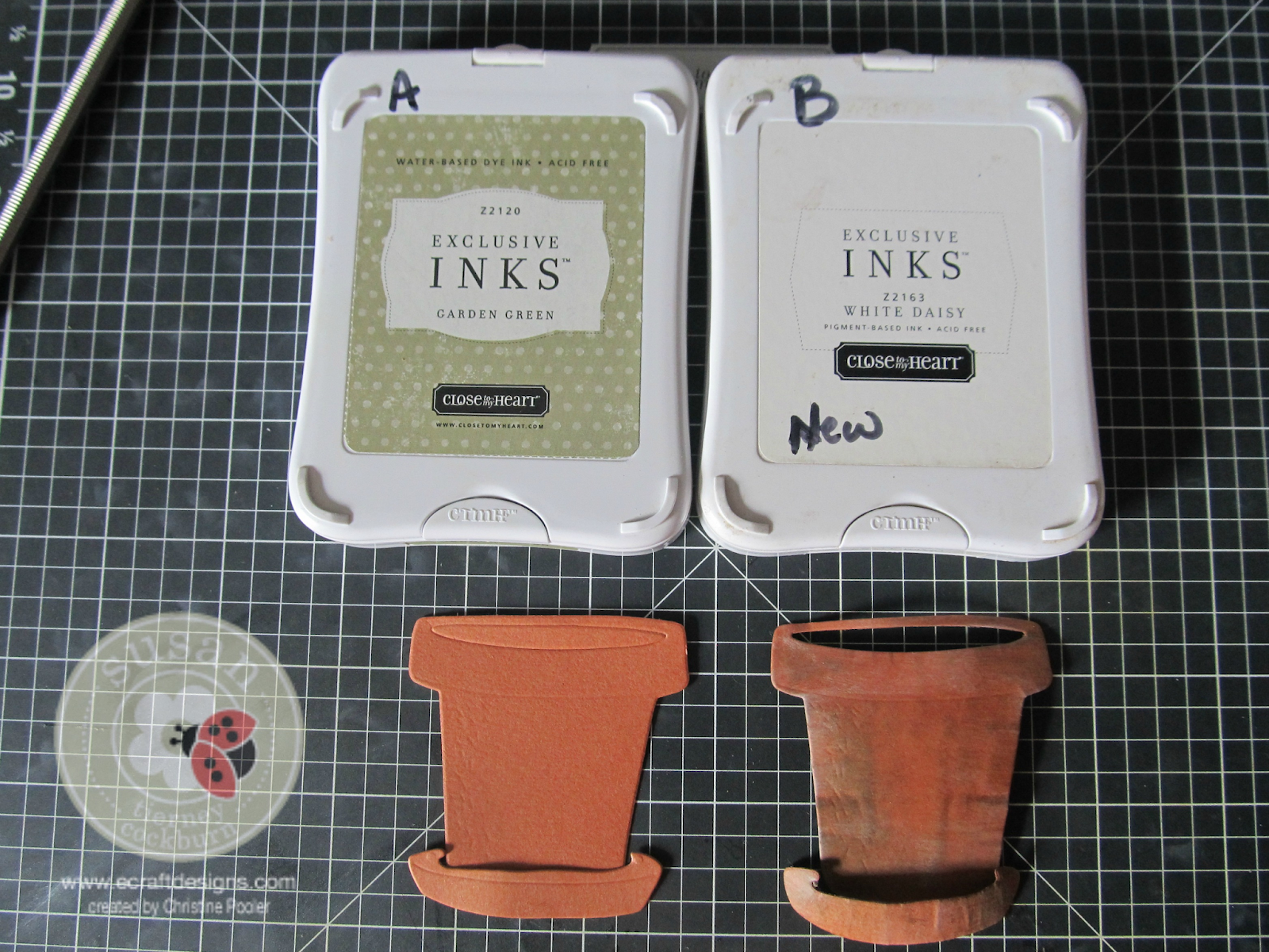 - On 1 pot and saucer using green and white ink and makeup sponge shade to give it aged look.